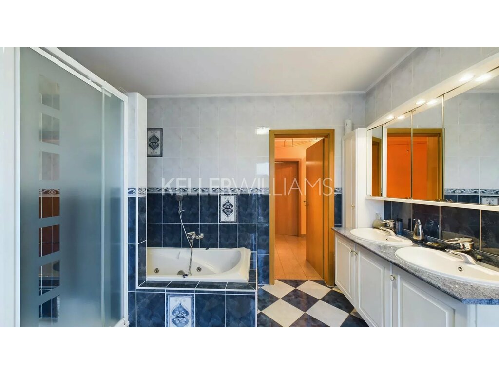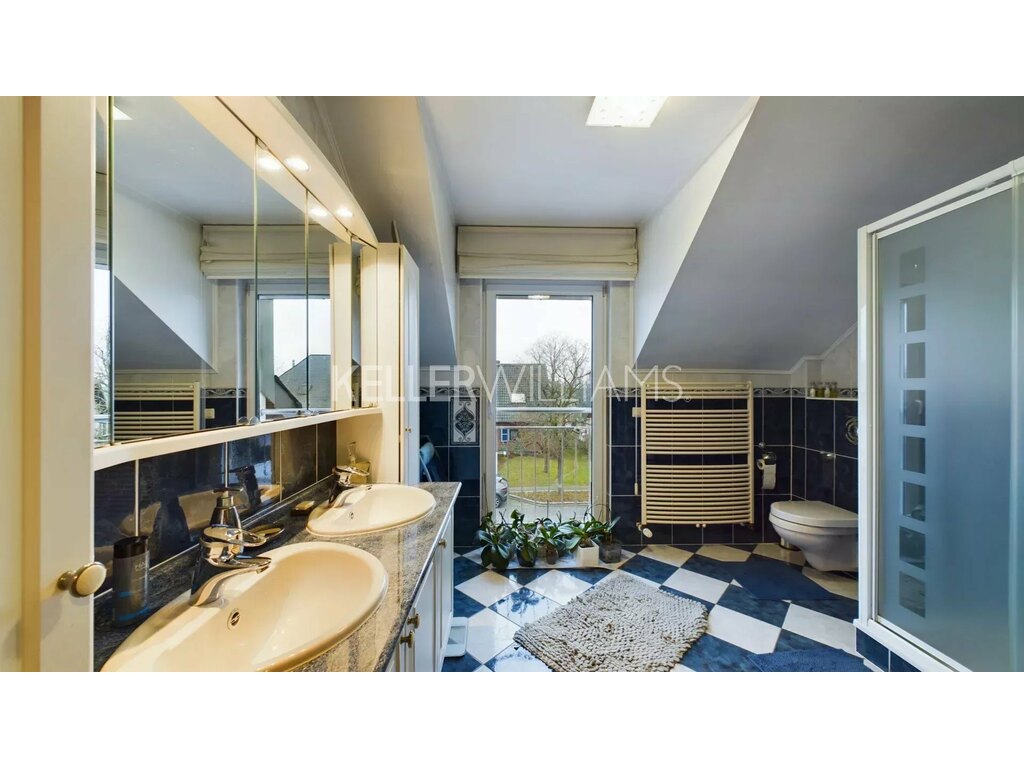 - Une salle de bain avec baignoire, douche, toilettes et double vasque.