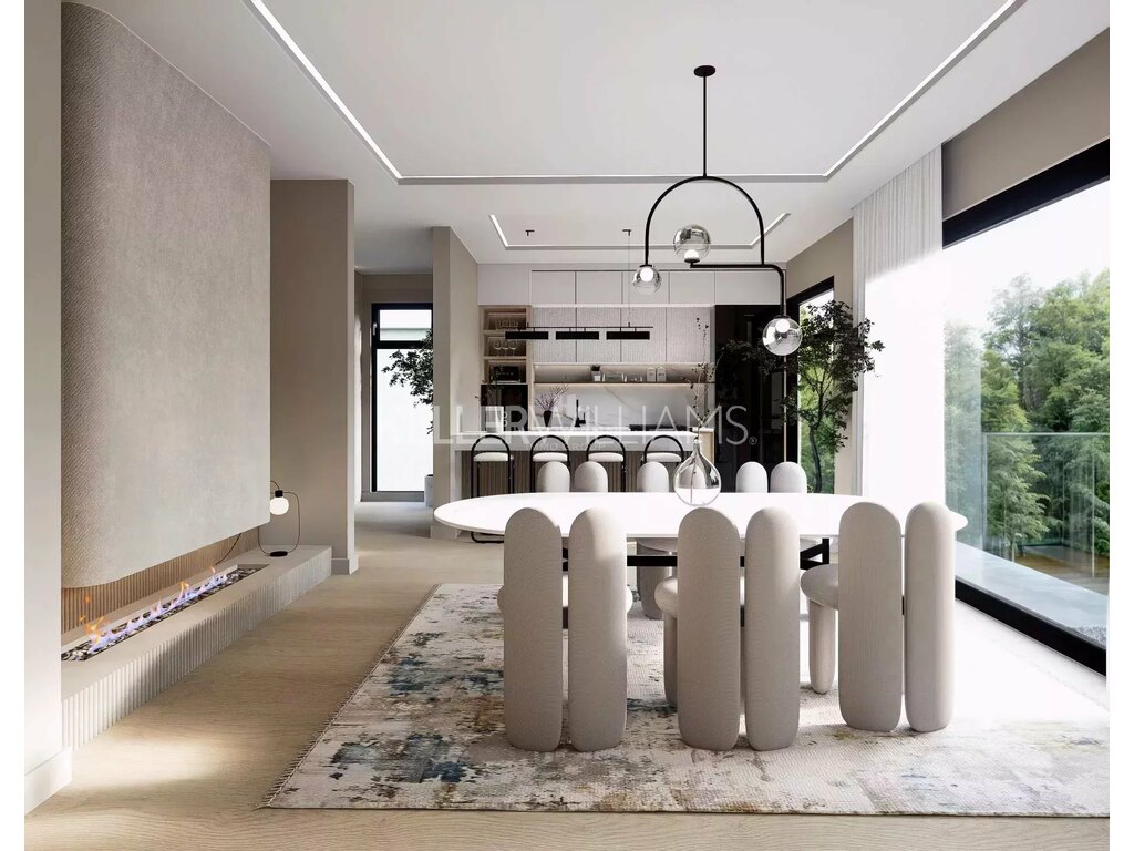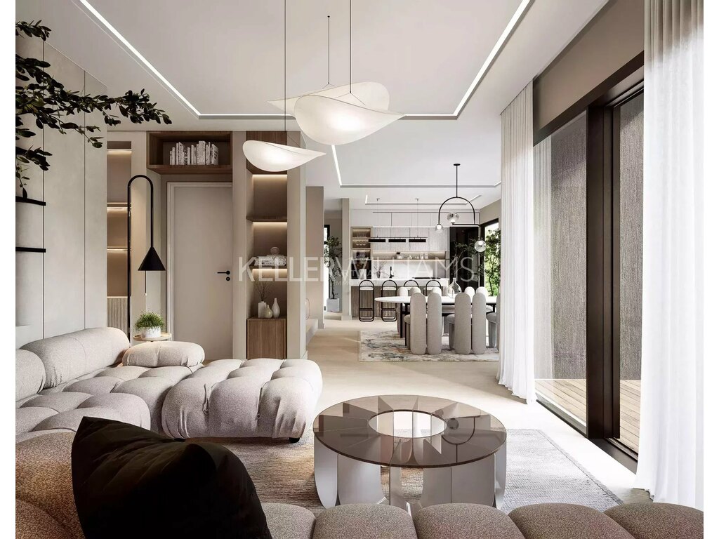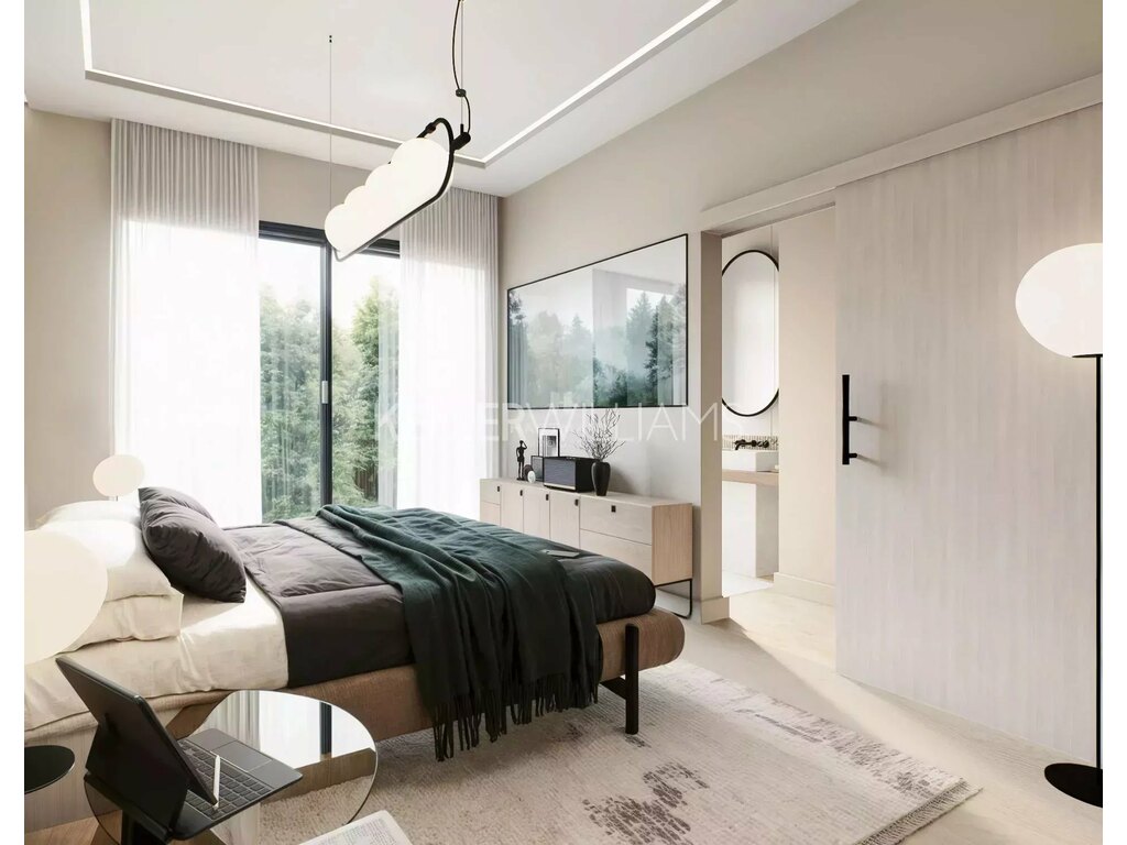 Le design intérieur est moderne et lumineux, avec de grands espaces ouverts, un jeu subtil de lumière et d’ombre, et des stores extérieurs motorisés à lamelles orientables permettant une gestion optimale de la lumière naturelle.