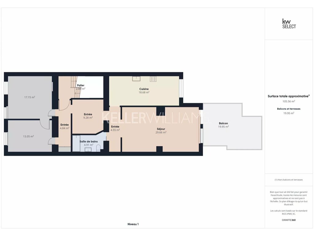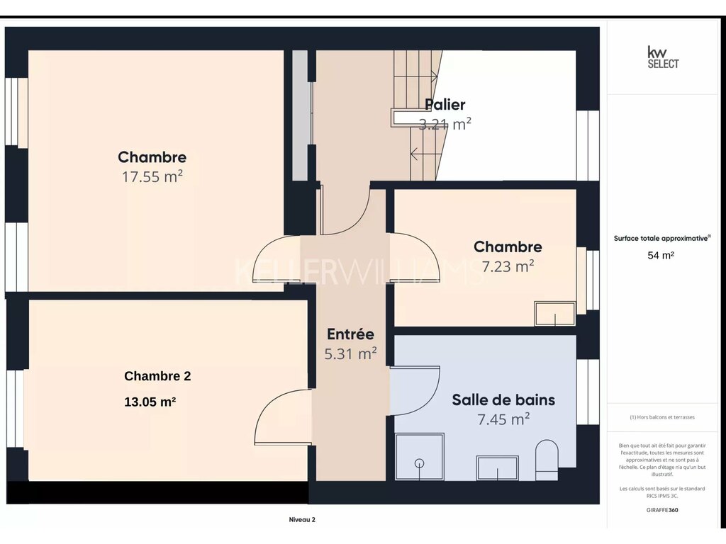 Ce niveau offre : une cuisine moderne et spacieuse, une pièce de vie lumineuse (salon/salle à manger), deux chambres confortables, une salle de bain soignée et surtout, un grand balcon de 20 m² orienté plein sud.
