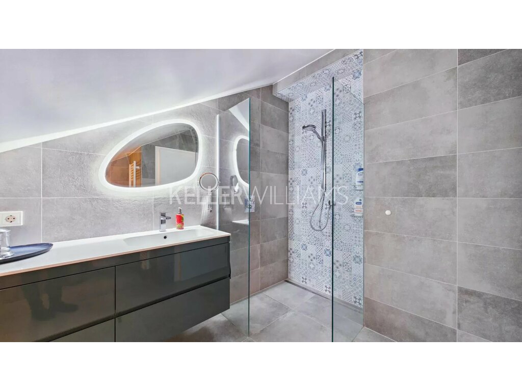 - À l’étage, une salle de douche moderne avec toilettes complète l’ensemble.