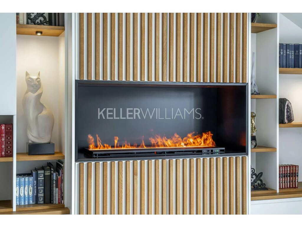 Le séjour-cuisine, d’une surface d’environ 50 m², profite d’une belle luminosité et s’agrémente d’une cheminée à vapeur d’eau, idéale pour créer une atmosphère chaleureuse.