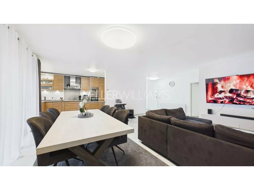 - Une cuisine équipée avec espace de stockage, ouverte sur un vaste séjour lumineux, d’une surface de plus de 40 m² et d’un accès direct sur le balcon;