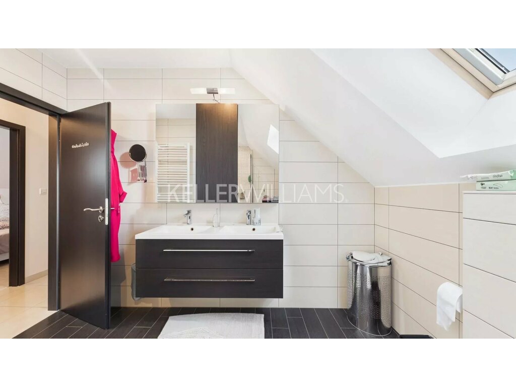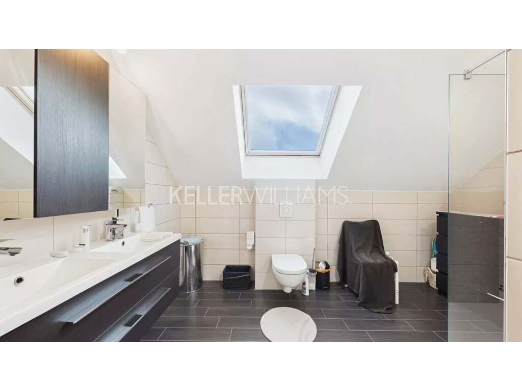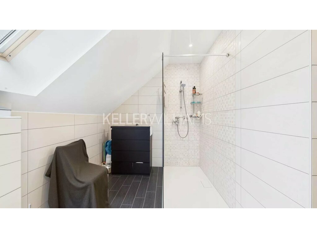 À l’étage, l’espace nuit se compose de trois chambres de 9,5 m², 13,8 m² et 12,6 m², ainsi que d’une salle de douche moderne équipée d’une double vasque et de toilettes.