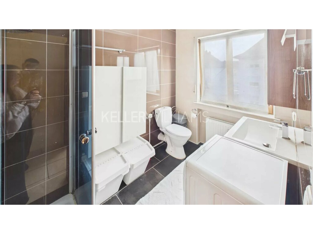 La salle de douche dispose d’un emplacement prévu pour le lave-linge, assurant une fonctionnalité optimale.