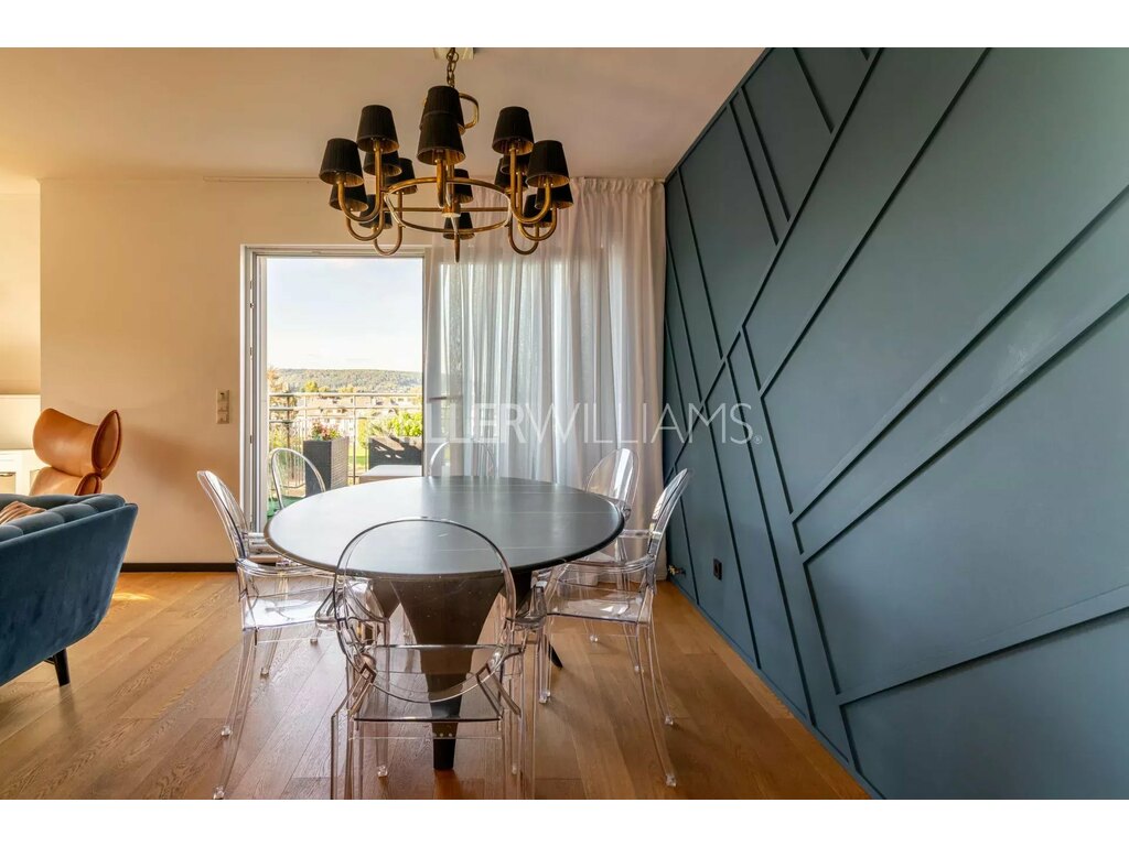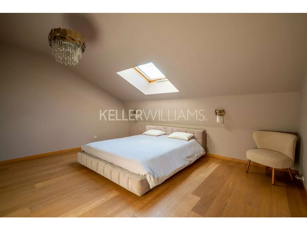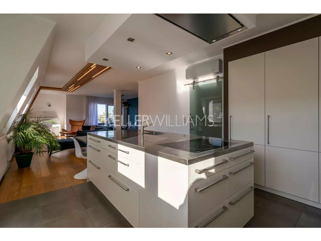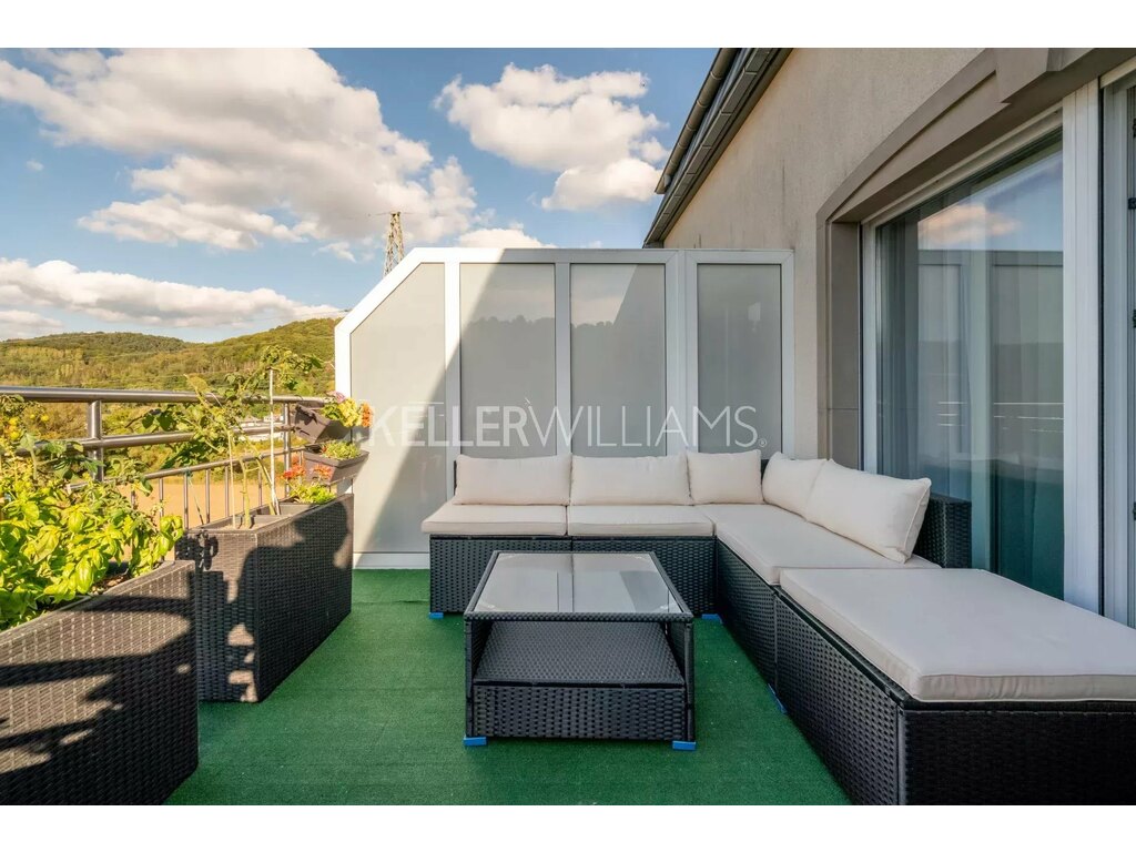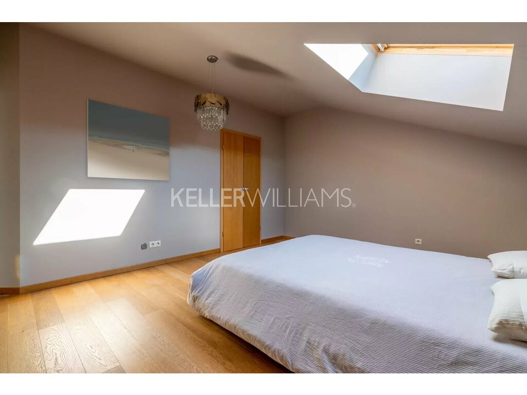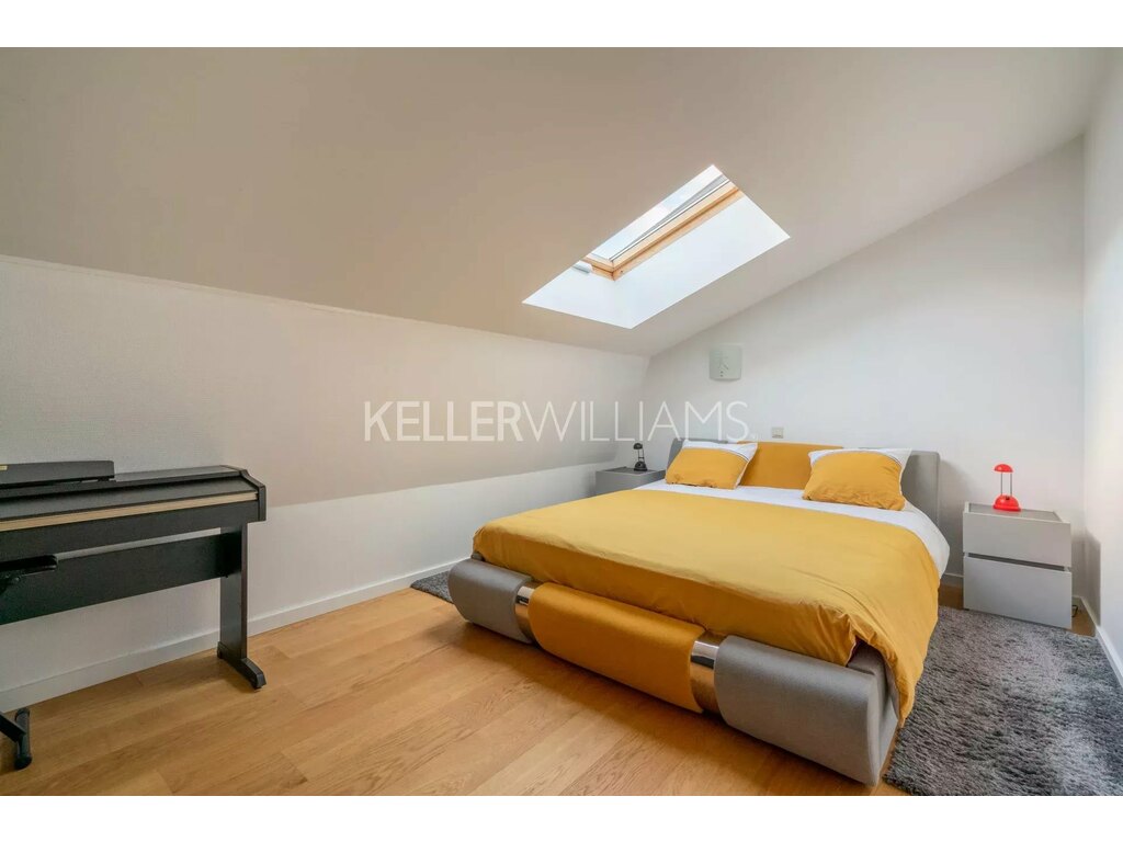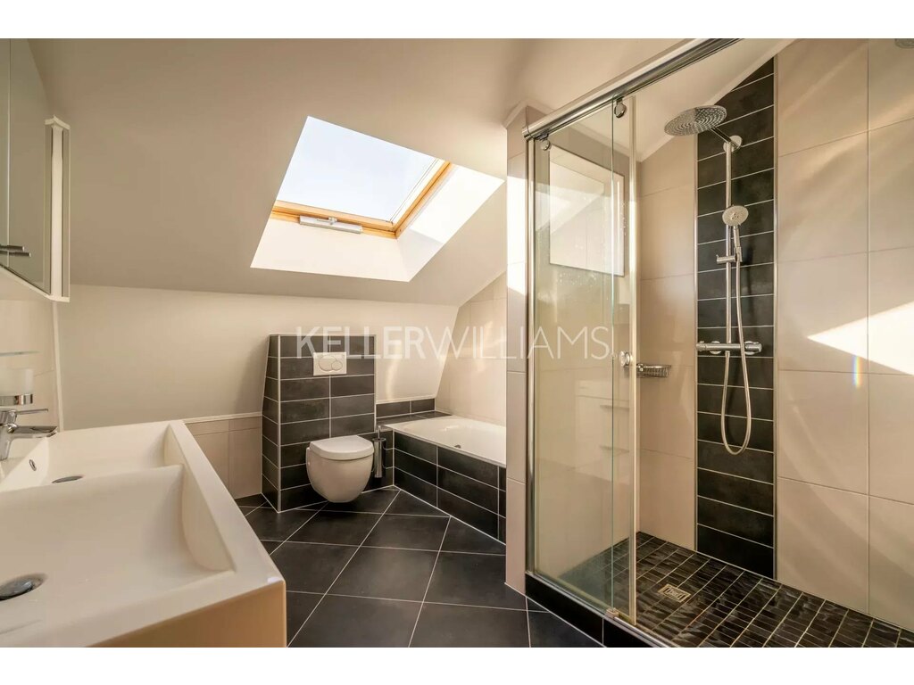 Le ton est donné, ce duplex perché aux derniers étages d’un immeuble récent, offre les avantages d’une maison : espace, luminosité, vues imprenables sur la nature, calme, finitions et équipements haut de gamme (porte d’entrée blindée), vidéophone, parquet et portes en chêne naturel, climatisation réversible dans tout l’appartement, triple vitrage, volets roulants électriques partout, velux à fermeture automatique et détecteur de pluie, etc.).
